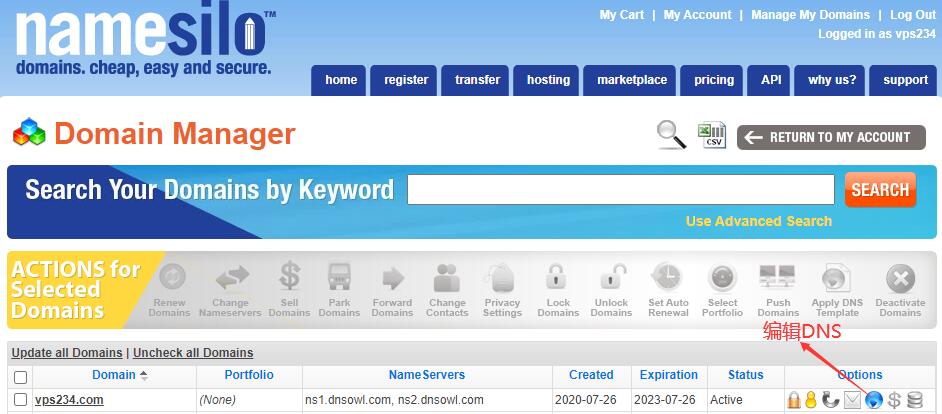 进入 Namesilo 官网下的“Manage My Domains”,编辑DNS。