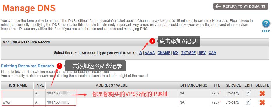 一般我们添加两条记录就可以,比如你注册的域名是zhihu.com,那么添加这样两条记录后,你的访问域名zhihu.com和www.zhihu.com都会指向你购买的VPS对于的IP。