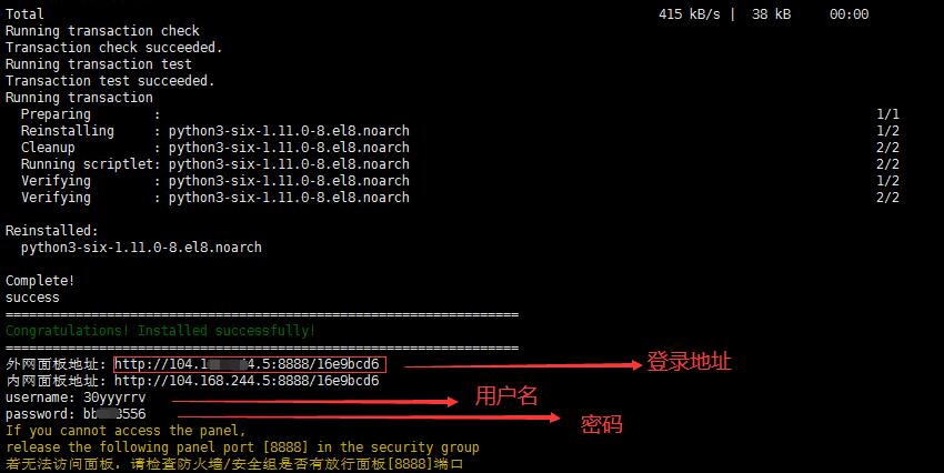 完成了之后就会显示宝塔面板的登录地址、用户名、密码: