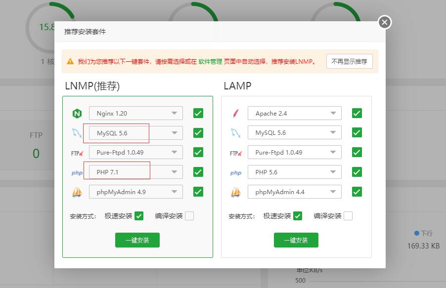 进入后需要你绑定宝塔用户没有就使用手机号注册一个就可以。绑定宝塔用户后就付弹出提示安装LNMP,Typecho理论上支持PHP 5.1以上的版本,但是这里最好还是选择PHP7.1以上(注意最新的Typecho版本必须要7.2以上了,所以最好选择7.2以上),使用MySQL5.6数据库,点击“一键安装”按钮就开始安装,如下所示: