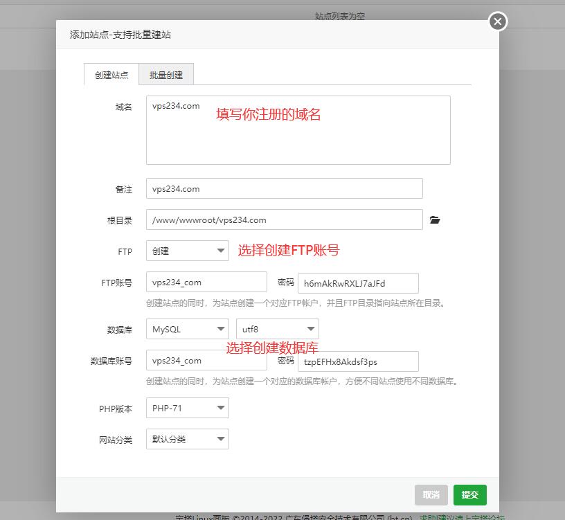 点击“网站”菜单,在“PHP”项目下点击“添加站点”按钮,然后在弹出框中填写你网站的信息(填写域名,并创建FTP和数据库):