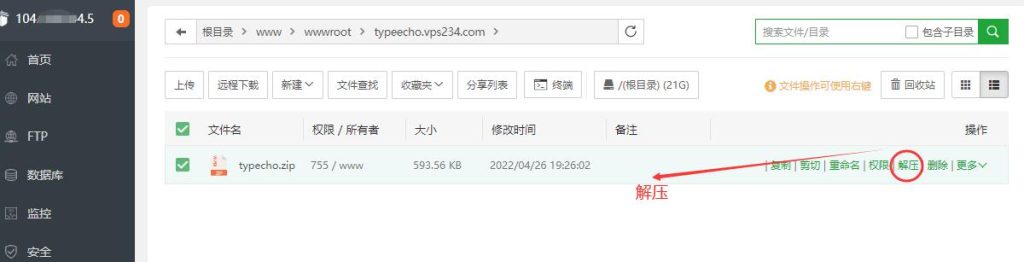 把该目录中的现有文件全部删除。然后把 Typecho 文件压缩包上传到网站目录中并解压,解压后就可以删除Typecho压缩包了。