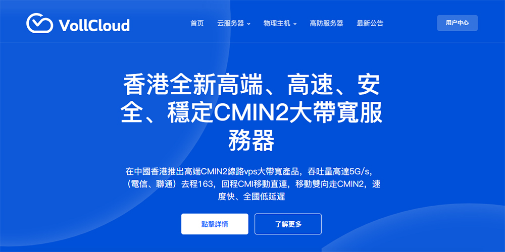 VollCloud宣布HK CMI 已经接入CMIN2,正式升级为CMIN2线路,全面优化和提高到大陆移动网络访问质量,线路特点:CMIN2线路,(电信、联通)去程163,回程CMI直连,移动双向CMIN2线路,全国低延迟,速度快;(移动用户优选线路);默认香港原生IP,解锁奈非和迪士尼。