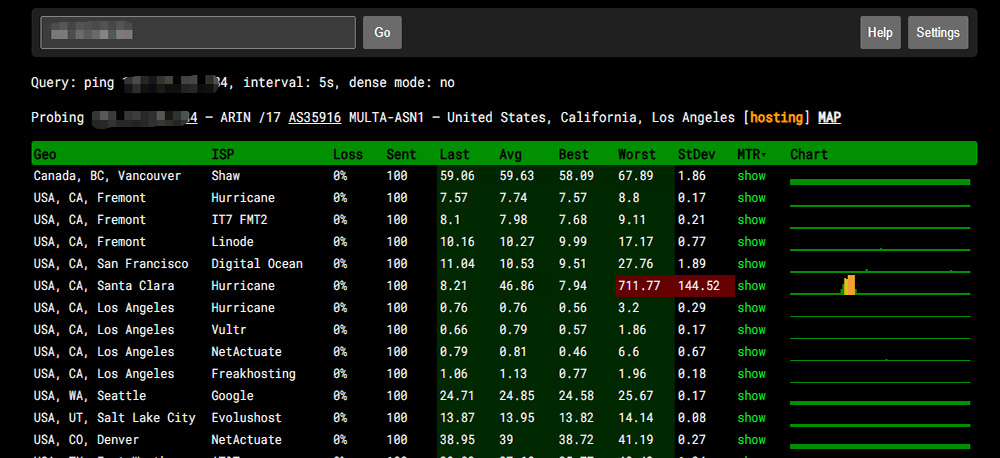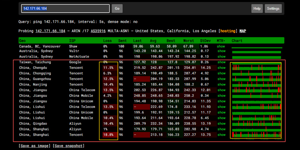 下图是一个国外VPS的测试结果,如果我们的用户是面向国内的,那么就主要关注下国内节点的丢包情况(红框部分,China开头),其中Loss一列就是你的VPS在这个节点的丢包率,我们在最后一列Chart中也可以非常直观的看出丢包情况,红色就是丢包,绿色就是网络情况非常好,例如这台国外VPS在全球各节点都没有丢包情况,但是在国内节点的丢包率就比较严重。