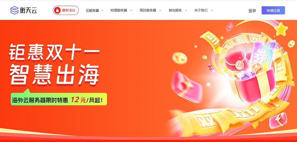 衡天云近期推出【钜惠双十一】活动:香港/美国/日本云服务器12元限量购买,8核16G云服务仅需200元每月,物理机最低只需296元一个月,全场低至1.6折起,年付低至2折续费同价。