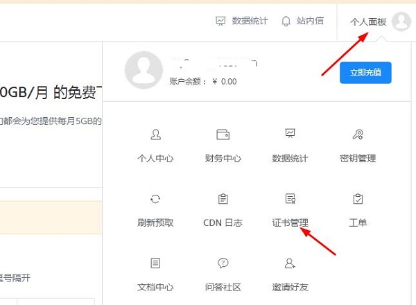 登入七牛云后台在右上角个人面板处点击展开,可以看到上图所示”证书管理”。