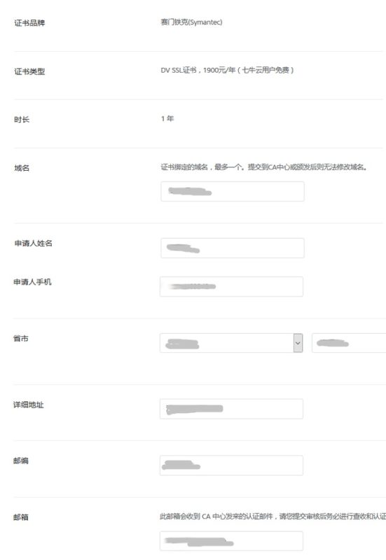 点击申请证书,可以看到需要填写的资料,请提前准备好需要使用的域名!