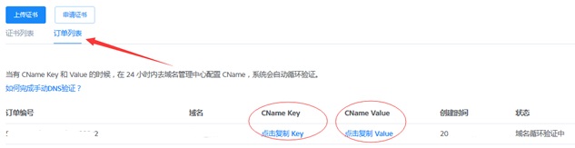 提交申请之后,在订单列表中可以看到申请域名,然后需要做一个验证所有权。到域名解析面板,添加CNAME别名解析验证。如果我们信息和解析没有问题,一般20分钟左右会显示完成。